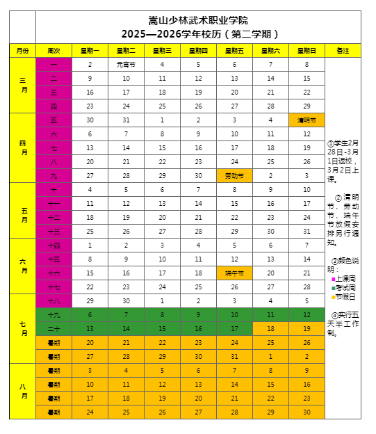 嵩山少林武术职业学院2026年寒假放假时间已经正式公布啦!根据最新消息,学校将从为1月19日至3月1日放寒假。春季学期将于3月2日(星期一)上课,共42天,足够大家好好休息调整,或者安排一些有意义的活动了。