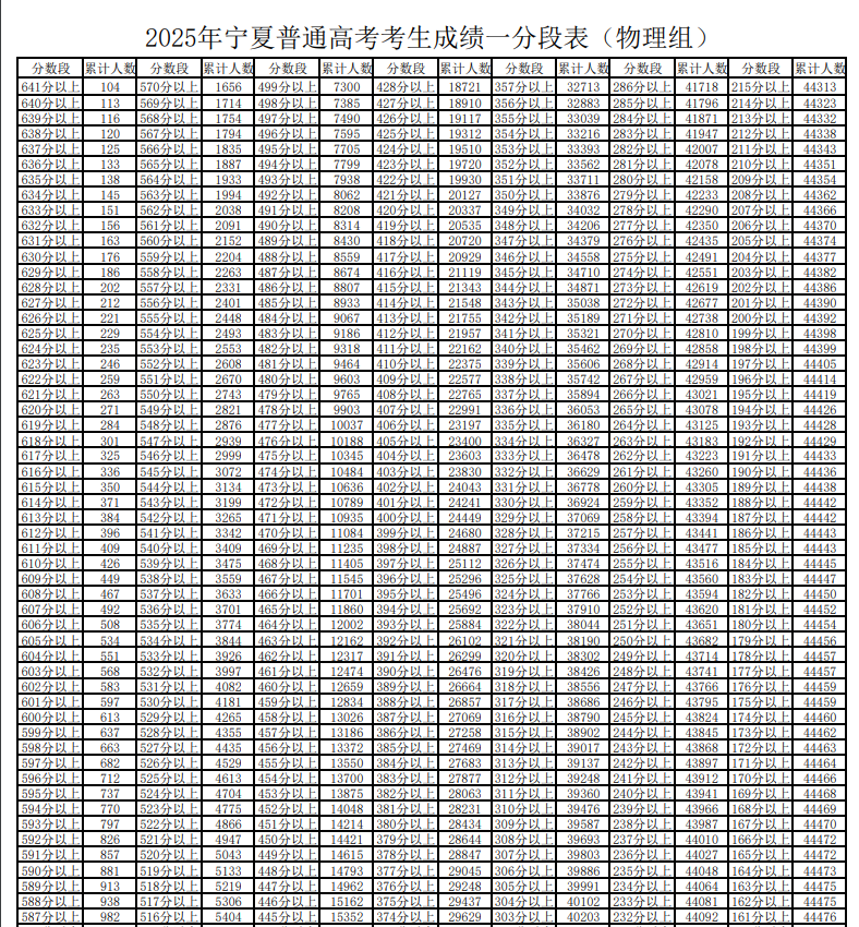 高考一分一段表意思是将全省同科类考生的档案分从高到低排列,再按每1分一段,统计“本段人数”;从本段向上一直到最高分段的所有“本段人数”相加,则为“累计人数”。小编为大家整理了2025年宁夏高考物理类一分一段表,2026考生们可以参考一下。