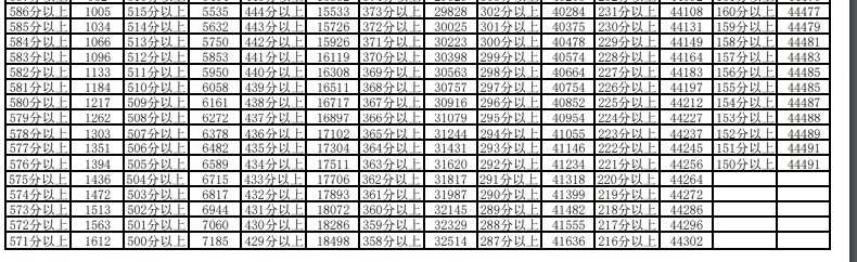 2. 我们把今年的位次,在去年的一分一段表中找到去年这个位次对应的分数,我们就知道去年这个分数可以上到哪些大学了,这样就大致定位好了学校。