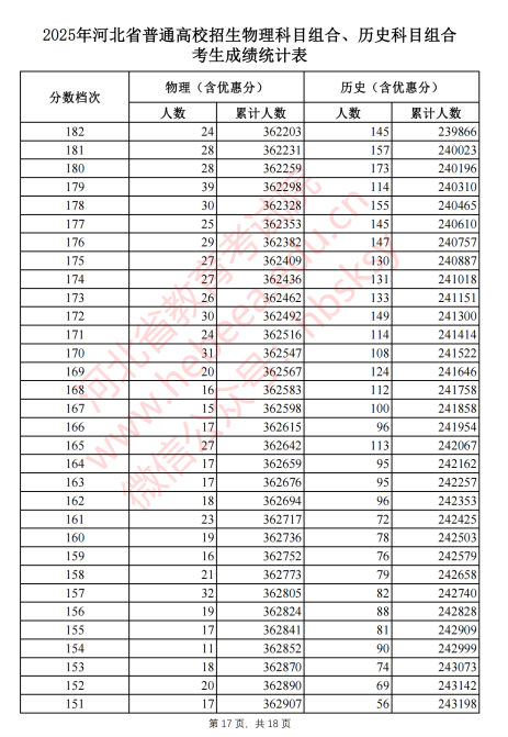 一分一段表,是将全省同科类考生的档案分(高考各科成绩+优惠加分)从高到低排列(分数相同的则为并列),再按每1分一段,统计“本段人数”。从本段向上一直到最高分段的所有“本段人数”相加,则为“累计人数”。下面是河北物理类一分一段表和位次对照表,仅供参考。