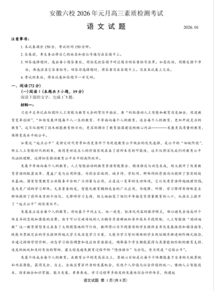 安徽六校2026届高三1月联考语文试题及答案汇总