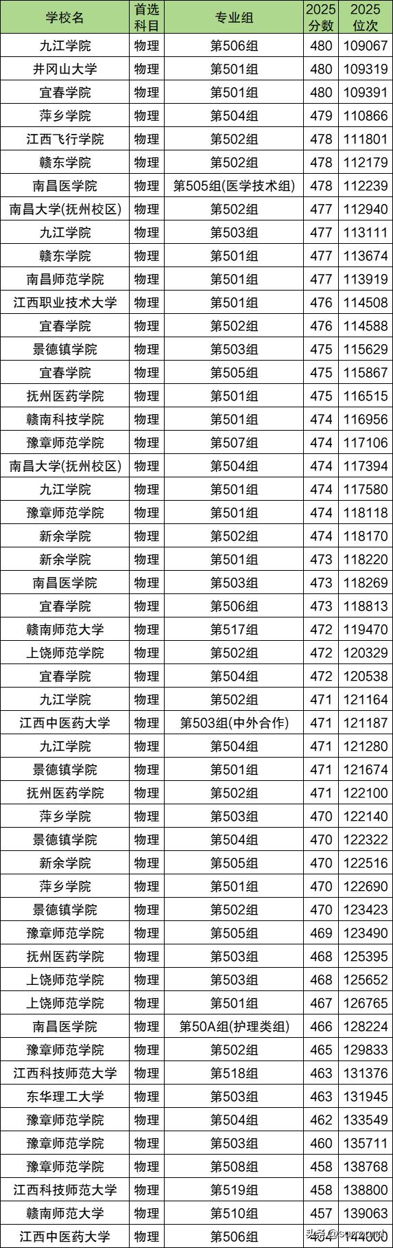 2025年江西省内450分到480分二本公办大学名单如下(位次144000名到109067名):