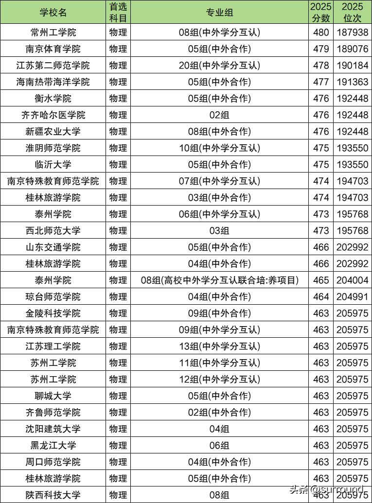 450分到480分录取的公办大学位次从248056名到200116名,最低的是琼台师范学院216组(中外合作),2025年最低分453分。